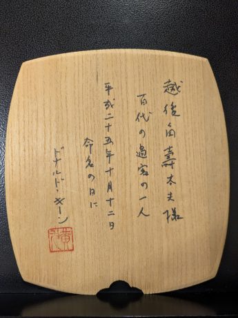2008年、越後角太夫(キーン誠己)に入門。2010年ポーランドで開催されたグダンスク・シェイクスピア・フェスティバルに角太夫の代役として出演、りゅーとぴあ能楽堂シェイクスピアシリーズ「ハムレット」の劇中劇の場をつとめる。2013年、ドナルド・キーンより越後角壽太夫と命名される。