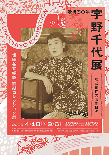 若き日には、画家の東郷青児とともに世田谷の淡島に“コルビジェ風”のアトリエ付きの瀟洒な家を建てて暮らしました。その作家としての人生は、尾崎士郎、東郷青児、北原武夫らとの数々の恋や、画家や詩人、評論家など各界で活躍する人々との華麗な交友関係の中で大きく花開いていきました。本展は、2023年度に世田谷文学館に寄贈された宇野千代旧蔵の新資料を前期・後期に分け、年間を通してご紹介するものです。