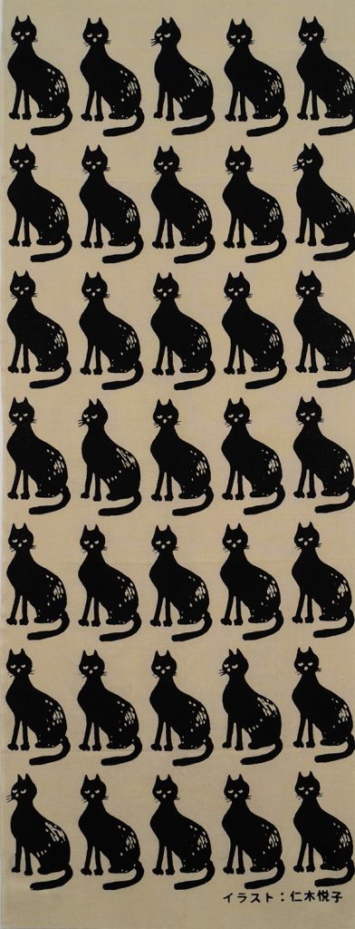 世田谷文学館のコレクションより、推理作家、童話作家・仁木悦子のイラストをもとに老舗てぬぐいメーカー「かまわぬ」で制作しました。ときどき表情の違う猫がいるのでぜひ探してみてください。