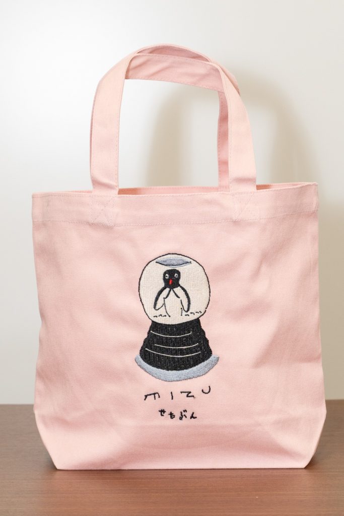 安西水丸さんのイラストレーションより、ペンギンのスノードームを刺繍バッグにしました。制作は“今を楽しむ刺繍カンパニー”の「シシュウブギウギ」。安西水丸さんのサイン「MIZU」も刺繍で表現しています。ペンギンの表情と「せたぶん」の文字がキュートです。